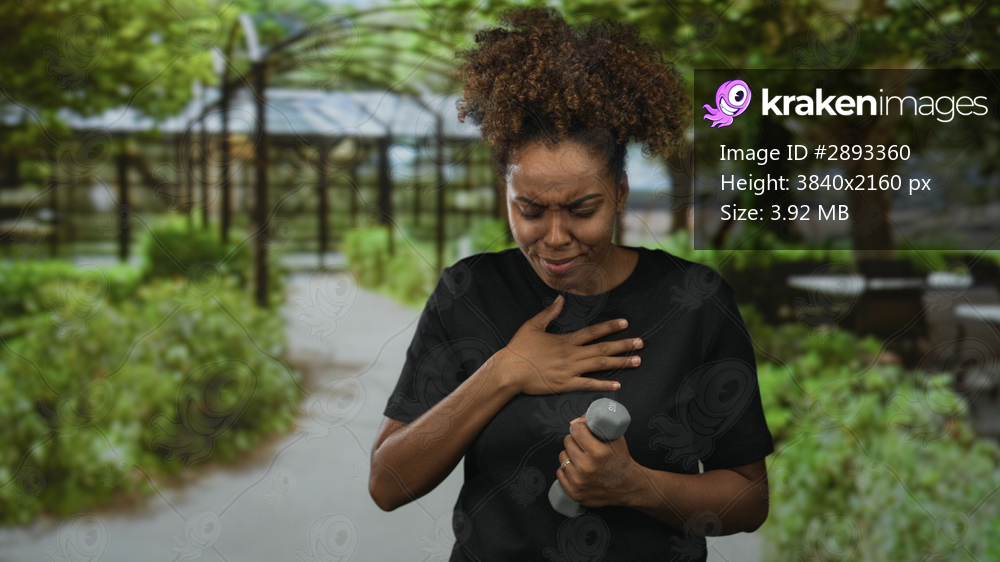 Young african american woman clutch chest and cough while holding dumbbell on park path near benches for heartattack; panic concern.