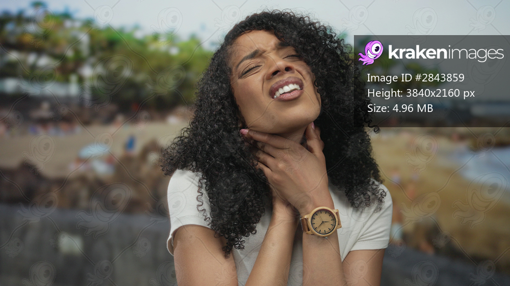 Young african american woman clutching neck in sudden pain while standing on sandy beach; distress throatache healing resilience.