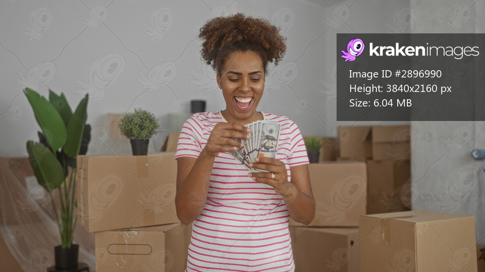 Young african american woman counting cash with hands among moving boxes in new house; joy financial success.