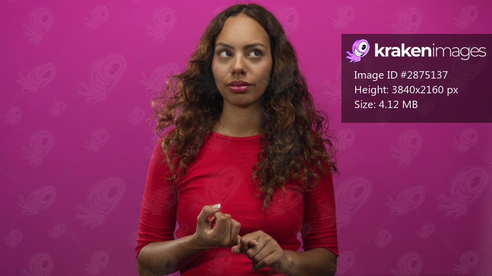 Young african american woman counting on fingers with hands visible in a magenta studio setting, curly hair framing face and red shirt; contemplation.