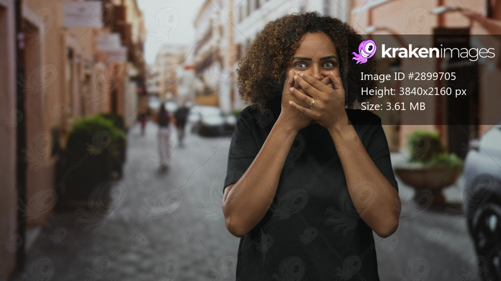 Young african american woman covering mouth with both hands on a cobblestone city street, wide eyes and casual black shirt; surprise discovery.