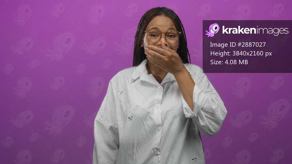 Young african american woman covering mouth with hand while pointing thumb to side in purple studio; surprise.