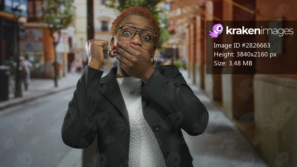 Young african american woman covers mouth with hand and raises fist on street lined with buildings in city center; surprise.