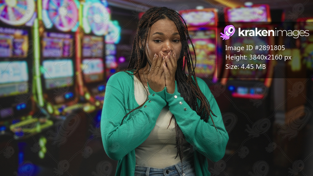 Young african american woman covers mouth with hands at a slot machine inside a casino building; shock gambling loss.