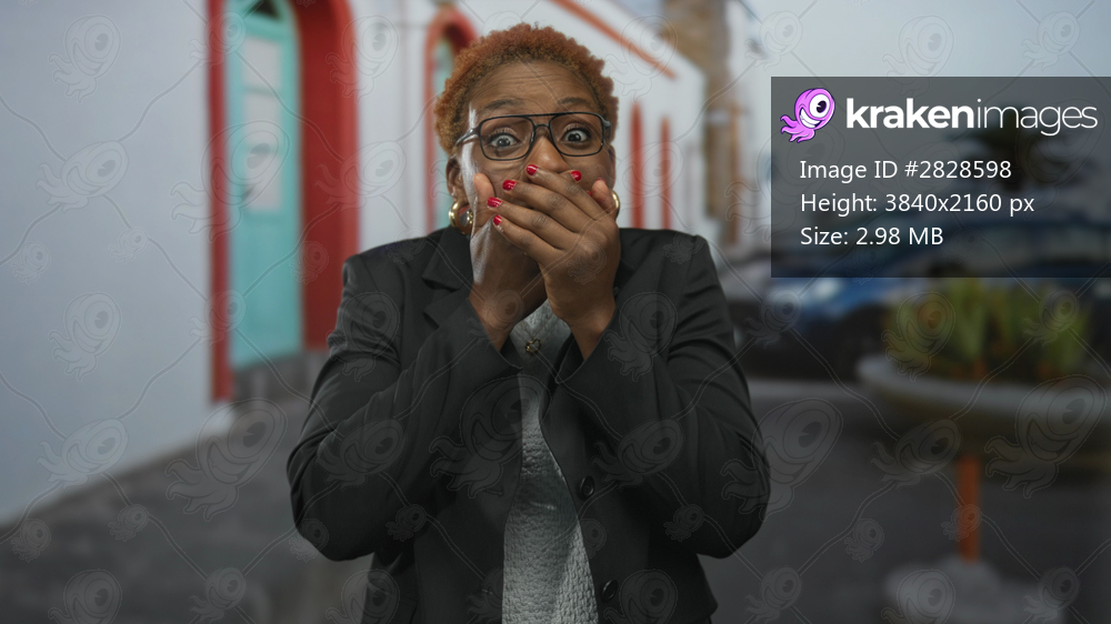 Young african american woman covers mouth with hands on sunny street in front of building entrance, wearing glasses and gold earrings; surprise.