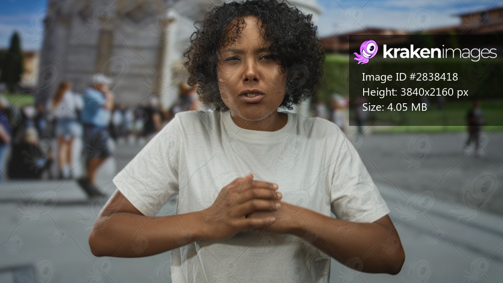 Young african american woman cracking knuckles on street near pisa tower under clear blue sky; anger release.