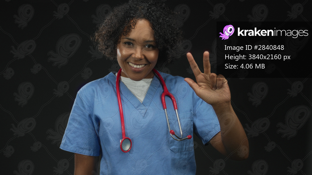 Young african american woman doctor counts fingers with stethoscope in studio; healthcare support trust.