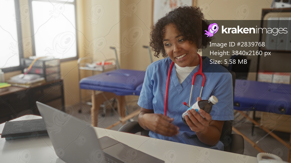 Young african american woman doctor holds medicine bottle beside laptop during online clinic consultation in building; compassion trust.
