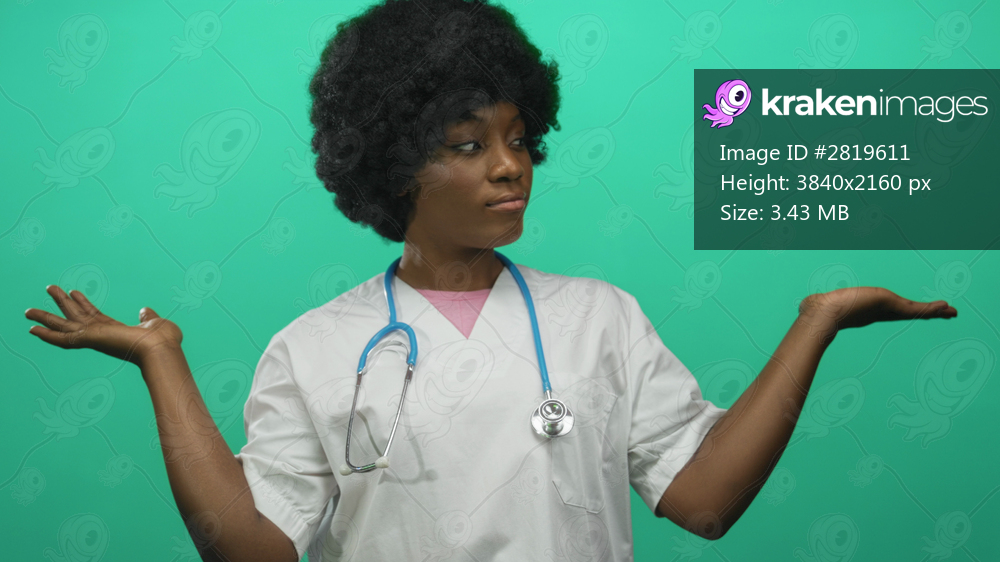 Young african american woman doctor with stethoscope holds palm up and tilts head in studio; compassion support.