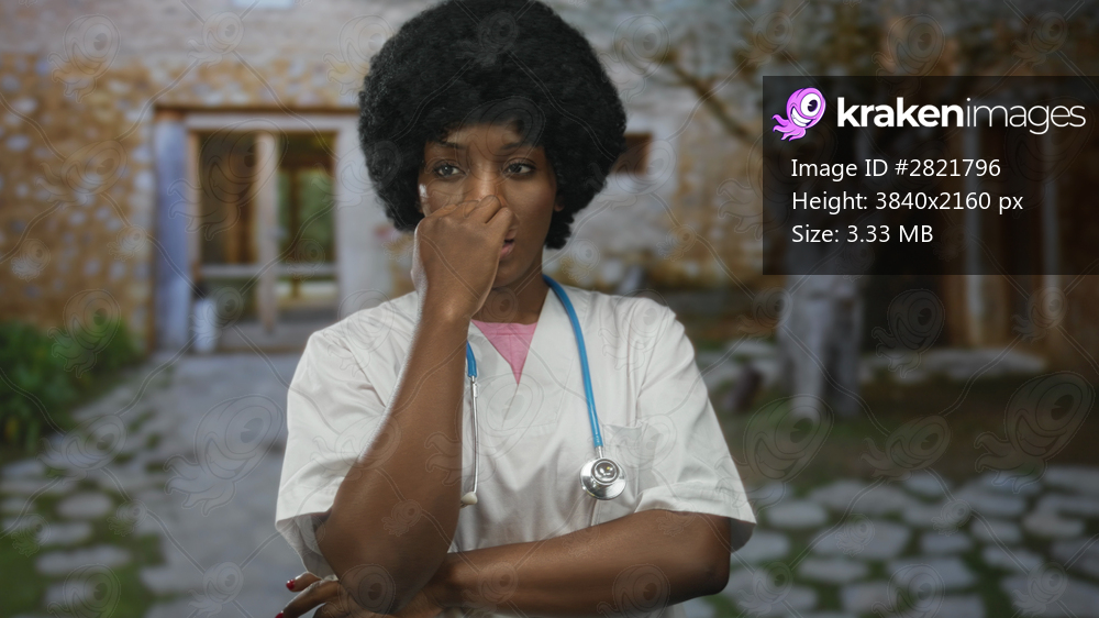 Young african american woman doctor with stethoscope pinches her nose at building entrance; disgust discomfort.