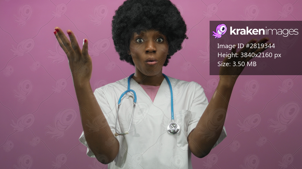 Young african american woman doctor with stethoscope presses fingers to temples in studio setting; stress.