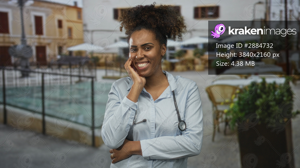 Young african american woman doctor with stethoscope smiling with hand on cheek and arms crossed while standing at a street cafe terrace near outdoor tables; friendly confidence. - Kraken Images