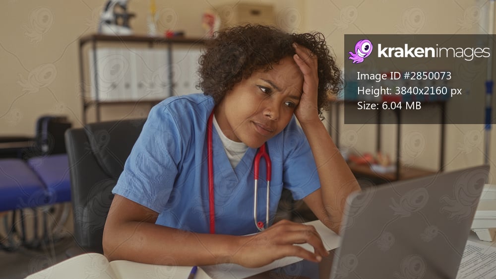 Young african american woman doctor typing on laptop at clinic desk furrows brow; stress fatigue overload.