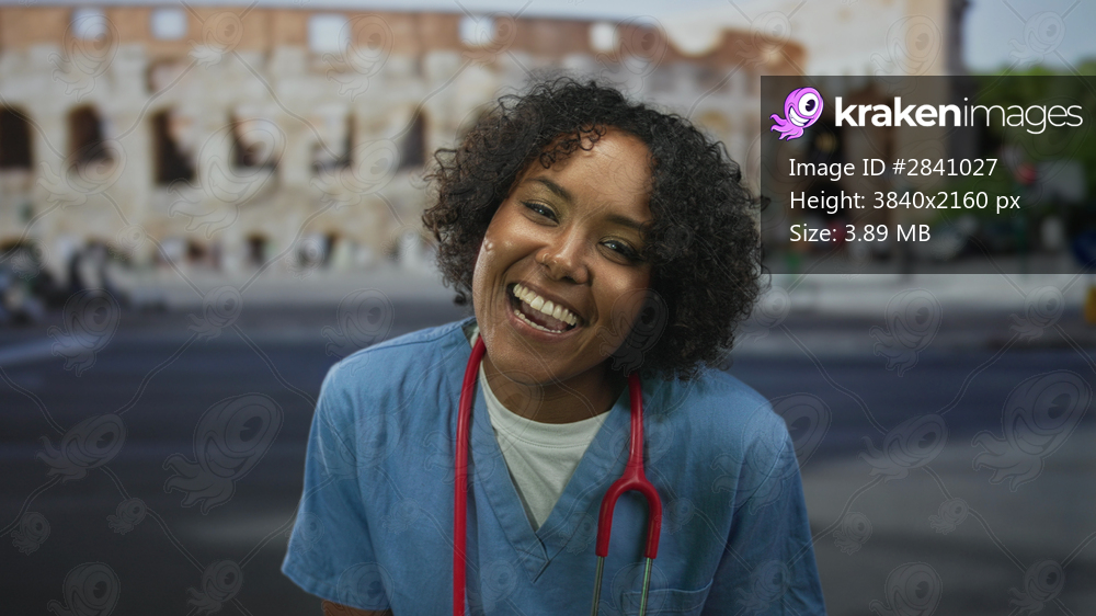 Young african american woman doctor wearing blue scrubs and red stethoscope smiling broadly at the roman coliseum building in rome; optimism.