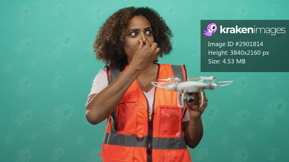 Young african american woman engineer holding a drone pinching nose in studio with teal backdrop and orange safety vest; disgust.