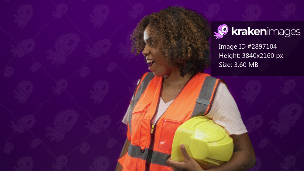 Young african american woman engineer holding yellow hardhat and wearing orange reflective safety vest and white t shirt in studio; confidence teamwork. - Kraken Images