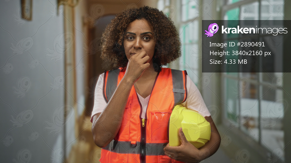 Young african american woman engineer holds yellow hardhat at her hip and smiles while wearing safety vest in hotel building corridor; confidence competence. - Kraken Images