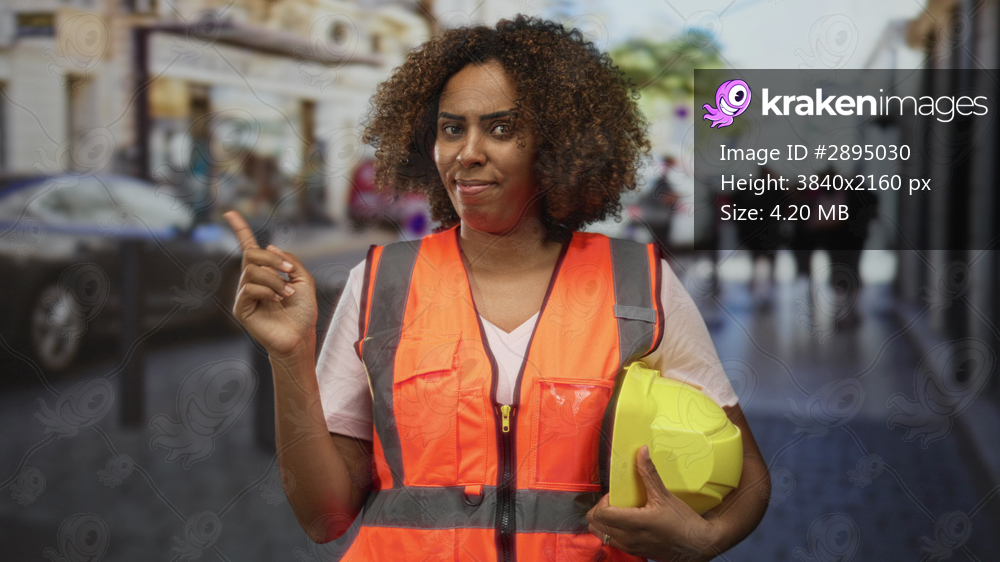 Young african american woman engineer points finger while holding yellow hardhat on a busy city street with blurred pedestrians; safety confidence.