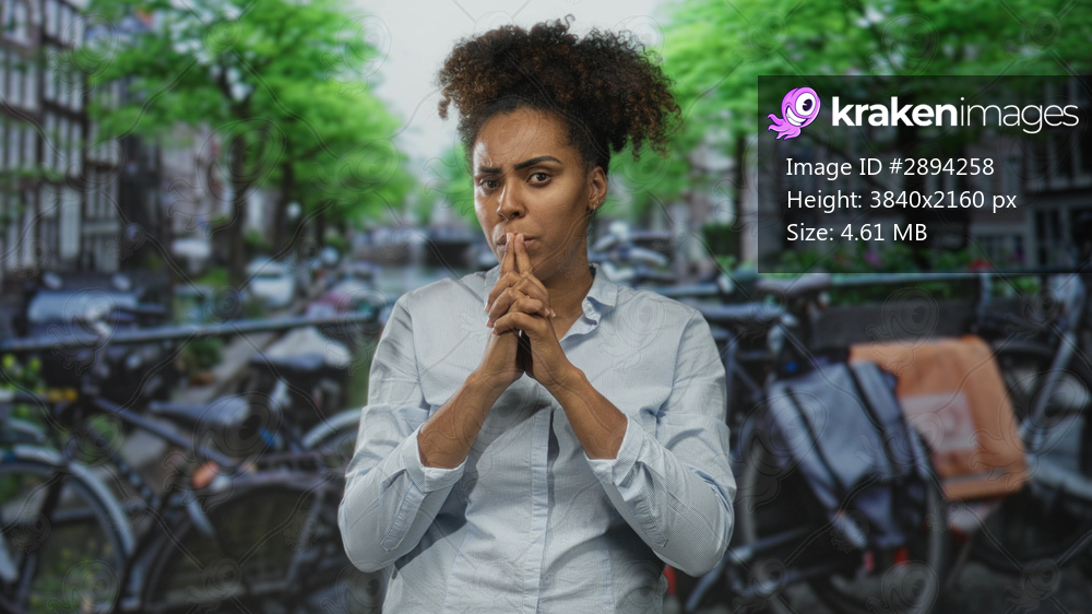 Young african american woman with finger to lips for silence standing on amsterdam street beside parked bicycles by canal and bridge; silence contemplation. - Kraken Images