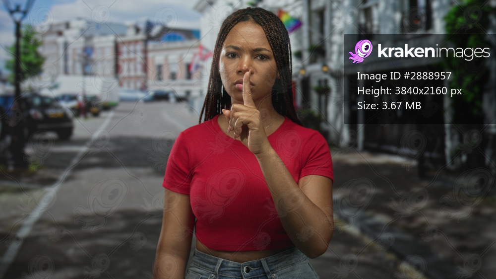 Young african american woman finger to lips on busy city street near storefronts and parked cars wearing red crop top; silence caution privacy.
