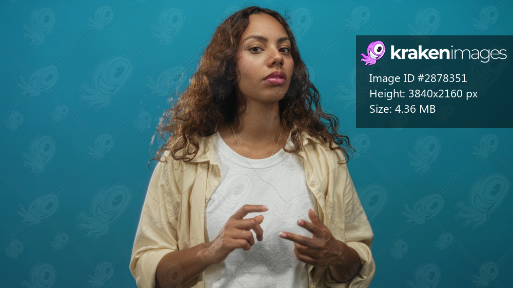 Young african american woman with fingers touching and steady gaze in studio against teal wall; quiet contemplation.