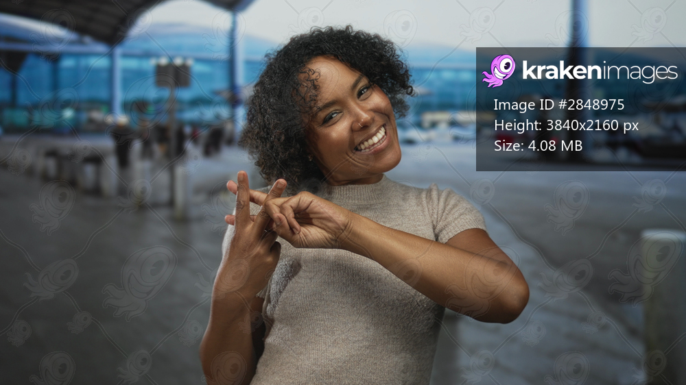 Young african american woman forms hashtag with hands at busy airport terminal; social connection joy.