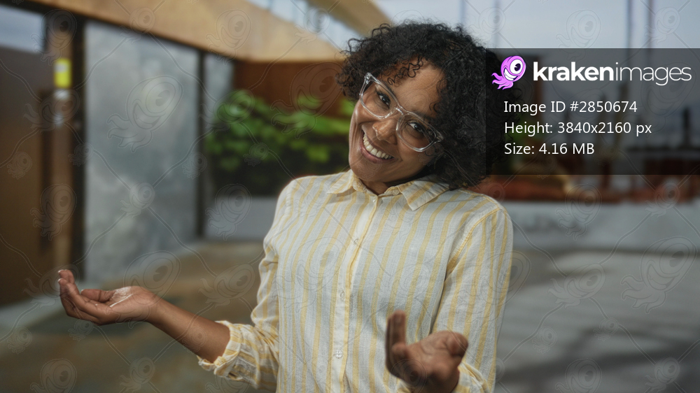 Young african american woman with glasses holds palms up at building entrance in sunlight; warm welcome joy.