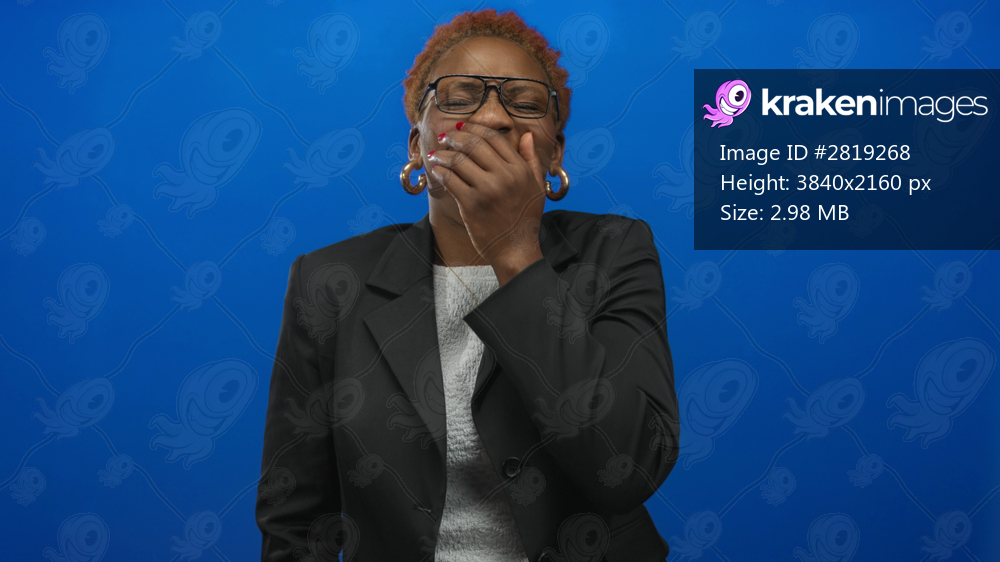 Young african american woman with glasses and hoop earrings covers mouth with hand in studio; amusement.