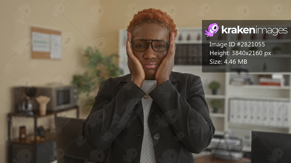 Young african american woman with glasses presses temples with hands for headache in office; stress.