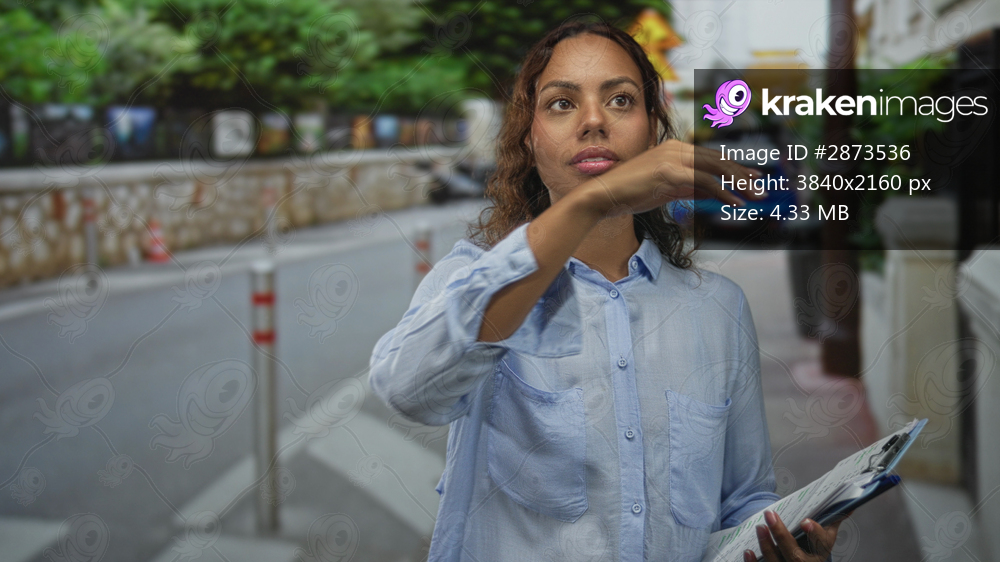 Young african american woman hailing a taxi on a street, holding a clipboard and pointing with her right arm; urban survey confidence.