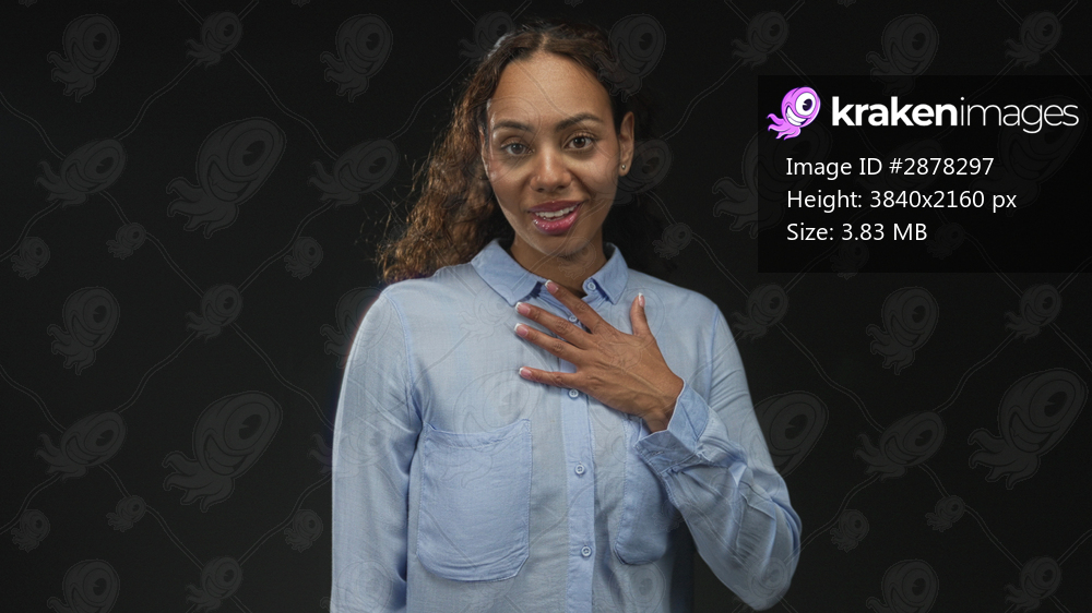 Young african american woman with hand on chest in studio with black backdrop and gentle grateful smile; gratitude appreciation sincerity.