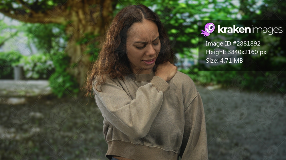 Young african american woman with hand on shoulder in forest park path showing discomfort while clutching shoulder; pain recovery.