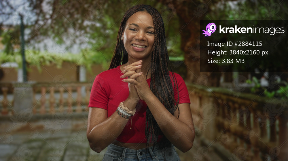 Young african american woman with hands clasped and clapping, smiling in red crop top on street by stone balustrade and tree; joyful gratitude.