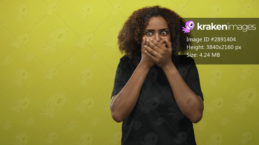 Young african american woman with hands covering mouth, curly hair and visible ring in yellow studio wearing black shirt; surprise secrecy concern.
