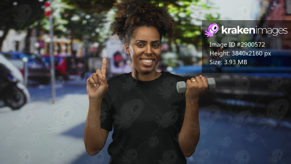Young african american woman holding a dumbbell and making a peace sign on a busy city street while smiling to camera; confidence wellness.
