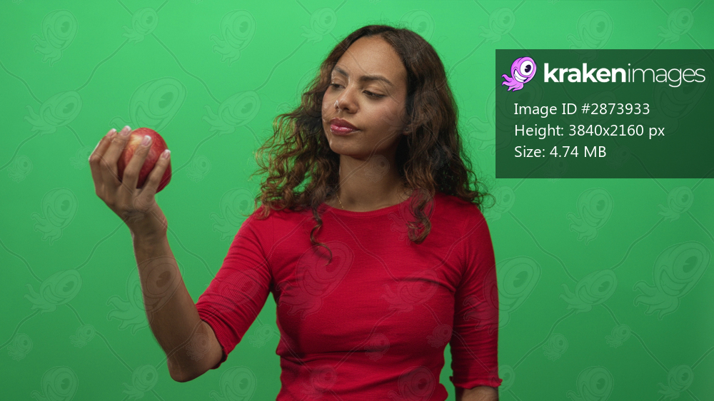 Young african american woman holding a red apple in a green studio, wearing red shirt and examining the fruit; contemplation.
