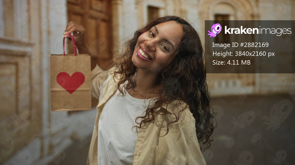 Young african american woman holding brown paper bag with red heart blows a kiss on old town street; love gift affection.