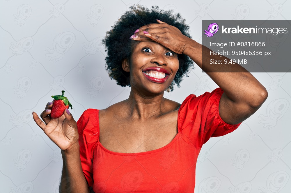 Young african american woman holding strawberry stressed and frustrated with hand on head, surprised and angry face