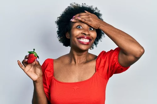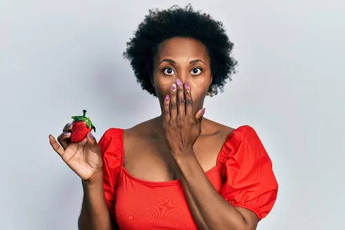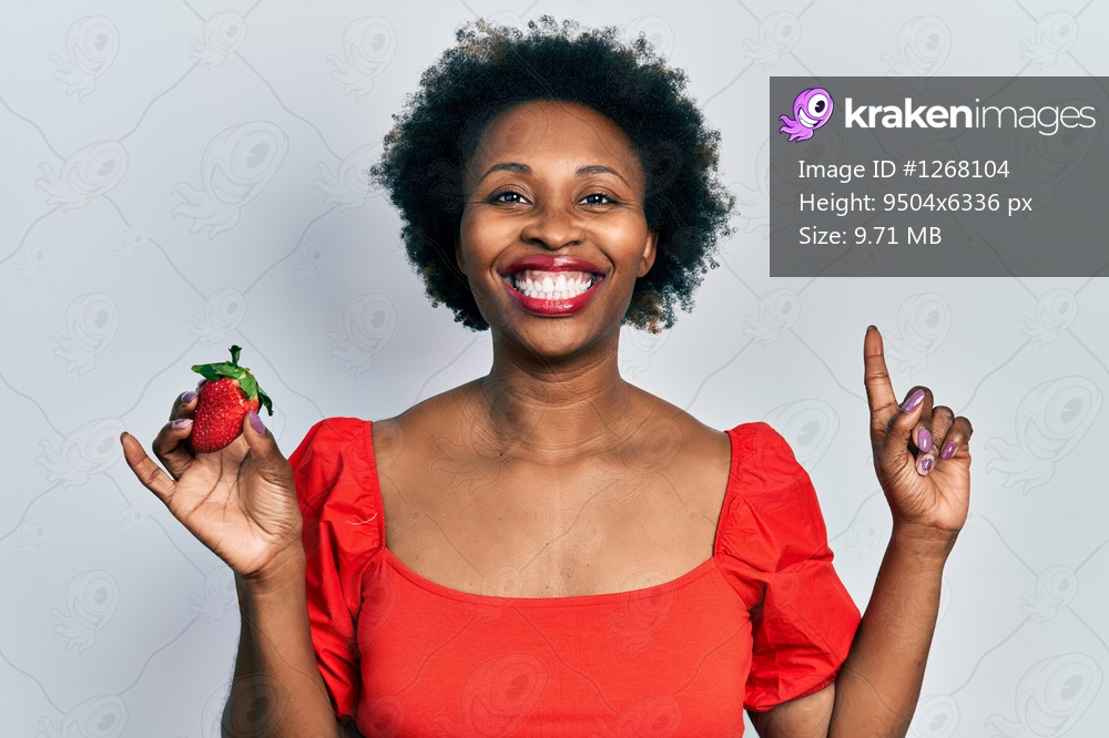 Young african american woman holding strawberry surprised with an idea or question pointing finger with happy face, number one