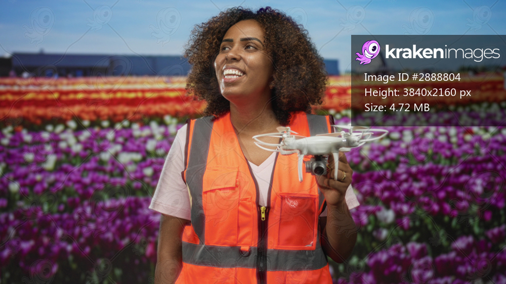 Young african american woman holds a quadcopter drone in hand beside rows of tulips in front of a building at a flower field; joy innovation.