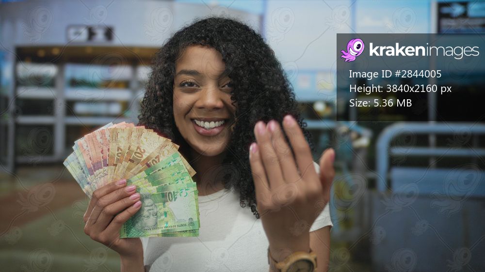 Young african american woman holds rand banknotes and beckons with hand in airport terminal; invitation.
