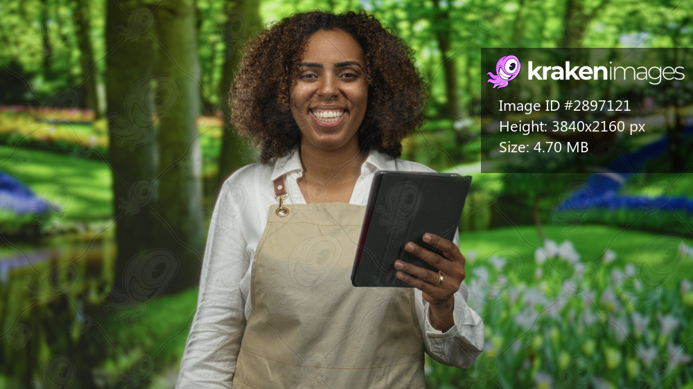 Young african american woman in beige apron holding a tablet and smiling while standing in a green forest with tulips and trees; small business pride.
