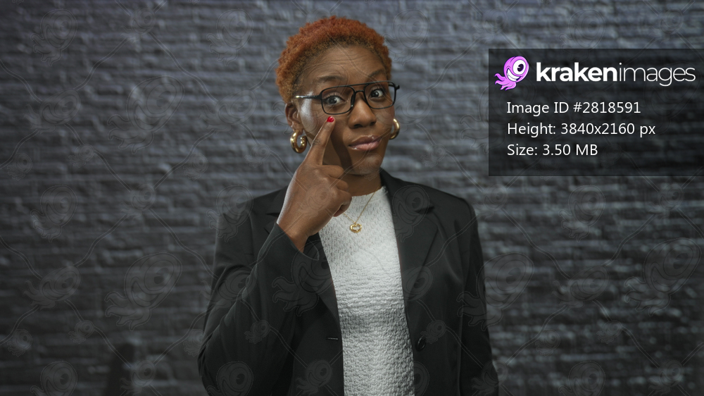 Young african american woman in black blazer points finger to eye against brick wall in building; focus.