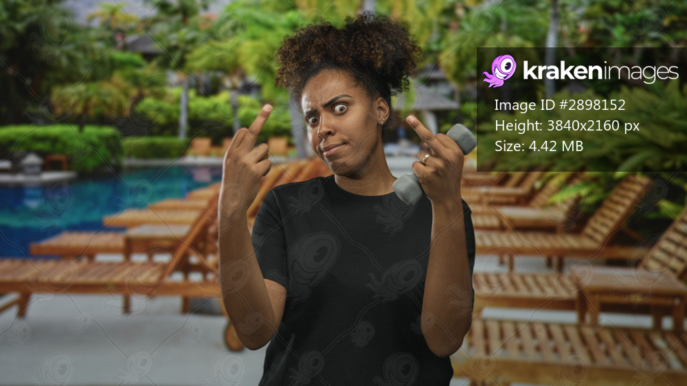 Young african american woman in black shirt holding gray dumbbell and showing both middle fingers by a building poolside with wooden loungechairs; anger defiance. - Kraken Images