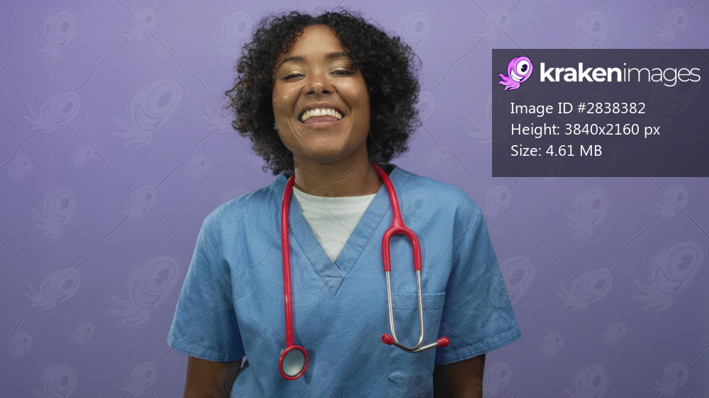 Young african american woman in blue scrubs wearing red stethoscope smiles in purple studio; compassion.