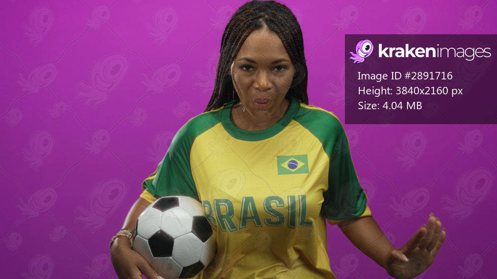 Young african american woman in brazil jersey holds a soccer ball and raises hand against magenta backdrop in studio; confidence team spirit.