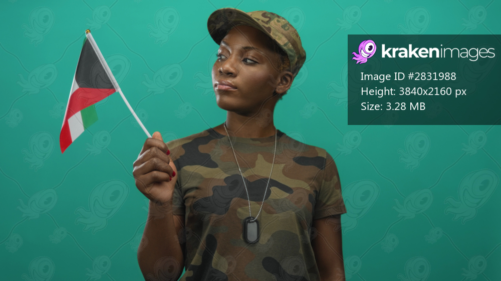 Young african american woman in camouflage uniform holds small kuwait flag with hand near chest in a studio; pride duty.
