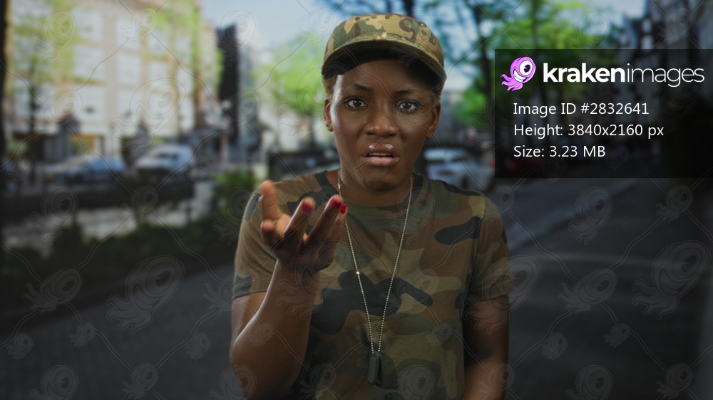 Young african american woman in camouflage uniform points finger forward on street and wearing dog tags; duty.