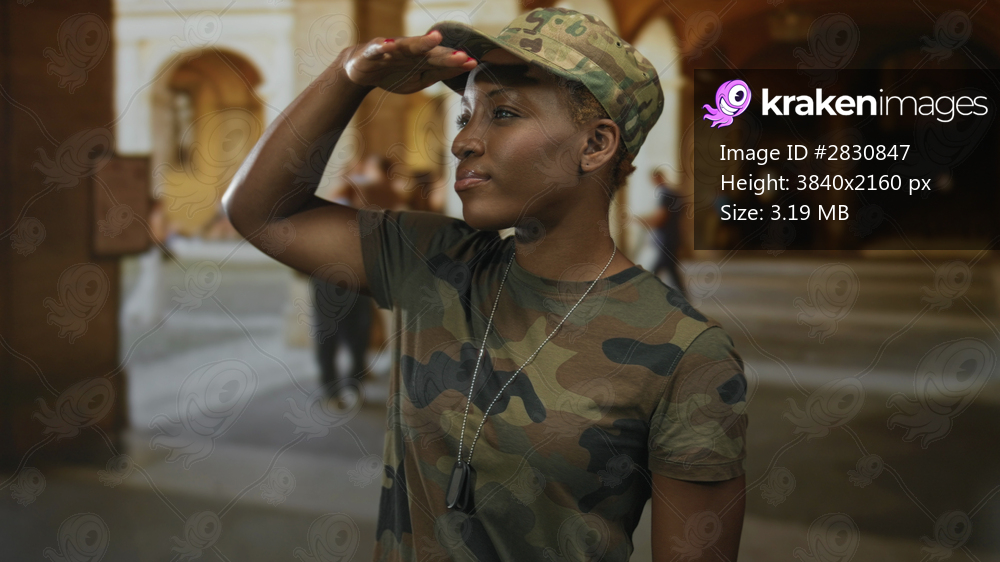 Young african american woman in camouflage uniform salutes with hand to forehead in street; pride service duty.