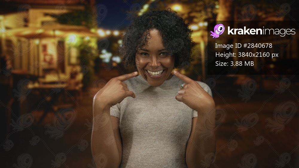 Young african american woman in gray sweater points finger to smile on urban street at night under warm lights; happiness.
